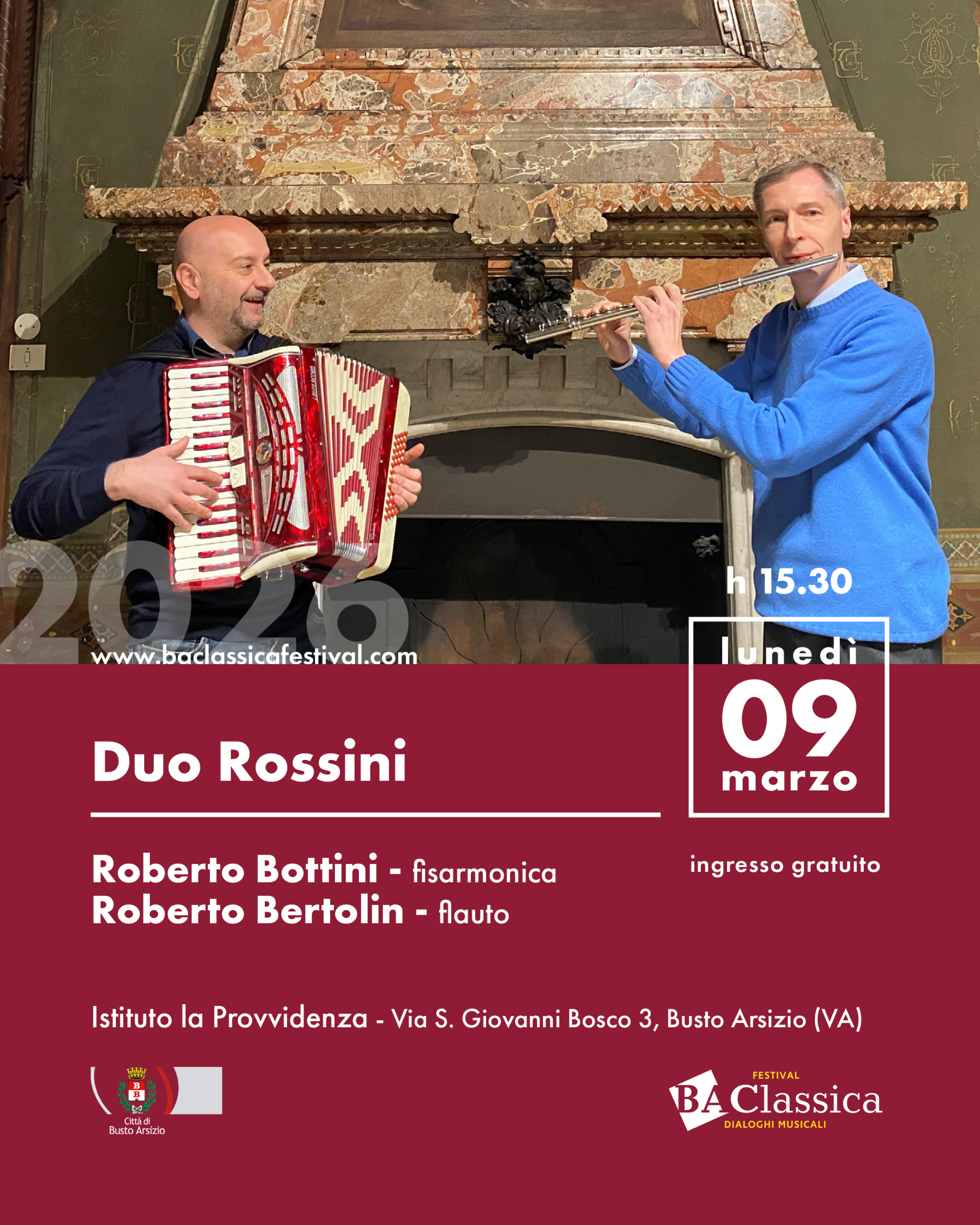 Il Duo Rossini nasce nel 2010 nell’ambito delle attività musicali promosse dall’Associazione Musicale G. Rossini Ets. Composto da Roberto Bottini, pianoforte e fisarmonica, e da Roberto Bertolin, flauto traverso, si esibiscono sia in formazione cameristica sia in ruoli solistici. Hanno all’attivo la partecipazione a importanti rassegne e festival musicali sia in Italia sia all’estero. Affiancano all’attività concertistica quella di docenza in qualità di docenti di strumento e di teoria musicale per la preparazione degli esami internazionali del Trinity College of Music di Londra.