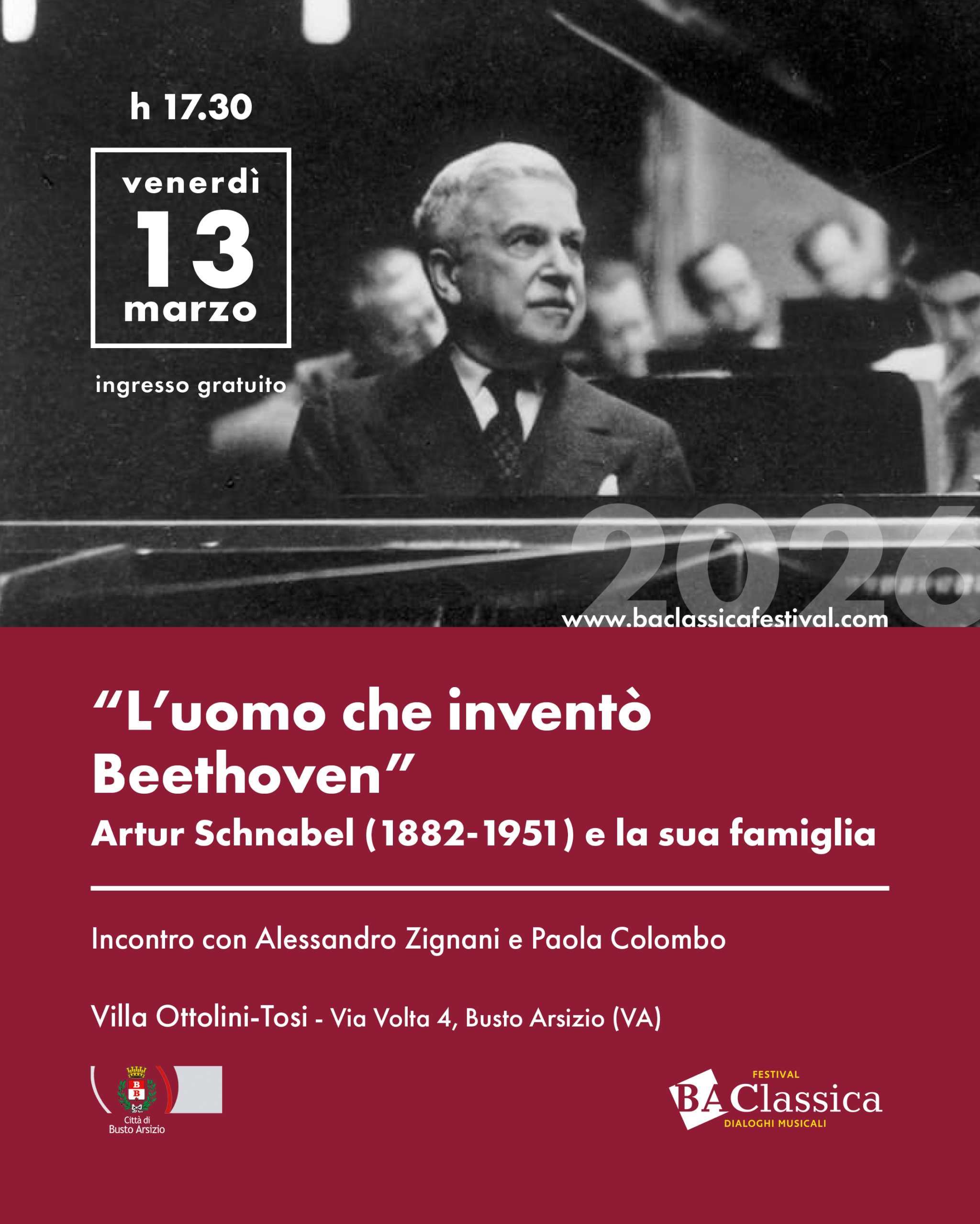 L’incontro presenta la figura del pianista, compositore e didatta austriaco Artur Schnabel nel 75° anniversario della sua scomparsa. Musicista ancora oggi noto al grande pubblico e ai giovani pianisti che si affacciano allo studio del pianoforte, Schnabel è riconosciuto come grande interprete del repertorio beethoveniano e non solo, riferimento interpretativo delle 32 Sonate per pianoforte che per primo eseguì a Berlino nel 1927 e incise successivamente nel 1935. Sposato con Therese Behr, contralto, ebbe due figli Karl Ulrich, pianista e insigne didatta, e Stefan, attore. Trascorre un periodo, dal 1933 al ’38 in Italia, a Tremezzo sul lago di Como, dove la famiglia continuerà ad essere presente fino ad oggi. Giunge poi in America dove svolse intensa attività concertistica ed insegnò in prestigiose Università formando giovani generazioni di musicisti tra cui Leon Fleisher. Dal 2002, la figlia di Karl Ulrich Schnabel, Ann, insieme al marito Francois Mottier, danno vita alla Schnabel Music Foundation in memoria dell’amato figlio Claude Mottier, brillante musicista e pronipote di Artur, prematuramente scomparso nel 2002, con l’obiettivo di condividere l’eredità musicale della famiglia con il mondo. Un viaggio affascinante, la storia di un pensare e “fare musica” come lezione di vita nella costruzione di un futuro migliore.